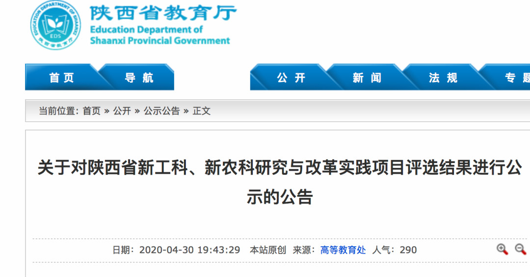 近日,陕西省教育厅在官网上公示了新工科、新农科研究与改革实践项目评选结果,共有180个项目进入公示名单。经学校申报、形式审查、专家评审,拟确定西安交通大学储能科学与工程专业新工科人才培养机制的探索与实践等158个项目为第二批省级新工科研究与实践项目,西北农林科技大学设施农业科学与工程专业优化改革攻坚探索实践等22个项目为省级新农科研究与改革实践项目。我校共9项新工科研究与实践项目进入公示名单,其中包括我...