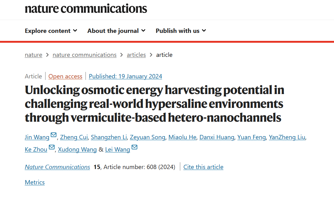 近日,我院膜分离技术团队王磊教授、王琎教授在国际权威期刊“Nature Communications”(《自然-通讯》)上发表了题为“Unlocking Osmotic Energy Harvesting Potential in Challenging Real-World Hypersaline Environments through Vermiculite-Based Hetero-Nanochannels”(蛭石异质纳米通道膜在实际高盐体系中的渗透能回收)的最新研究。论文第一作者为雷竞技RAYBET王琎教授,通讯作者为团队带头人王磊教授、王琎...
