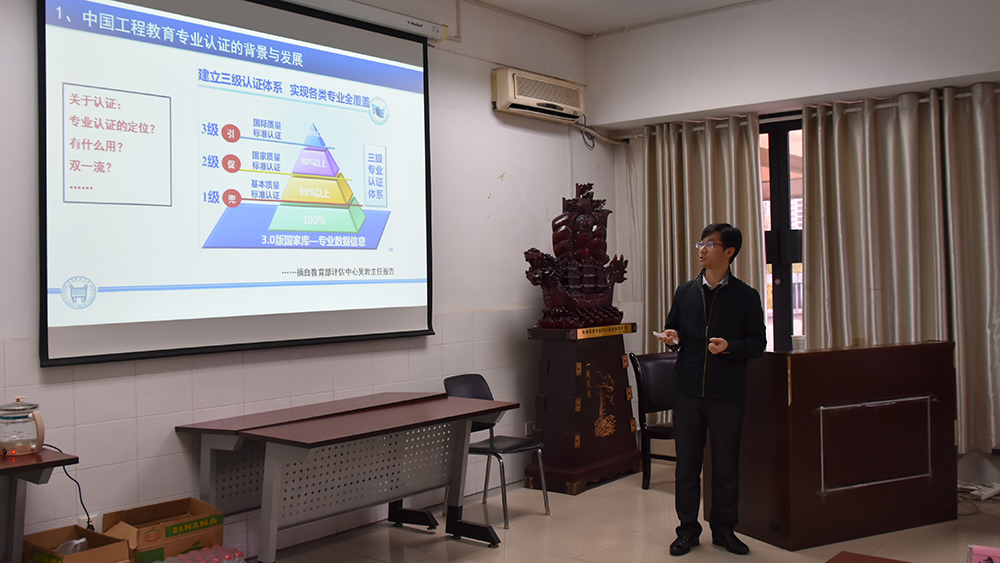 刘立忠副院长致欢迎辞,唐晓龙教授作了题为《新形势下的工程教育专业认证工作》的主题报告。唐教授结合自身十多年认证工作的经验,从中国工程教育专业认证的背景与发展、2017版通用标准修订的解读、专业认证报告的撰写、现场考察的部分建议等四个方面,向与会人员进行了全面详细的讲解和材料展示。报告会后,与会老师针对在自评报告的撰写、支撑材料的准备中遇到的问题,与唐晓龙教授进行了讨论交流;最后任勇翔院长对报告内容进行总结归纳。唐教授的报告使参会教师对工程专业认证有了进一步的理解,为明年环境工程专业认证工作奠定了基础。