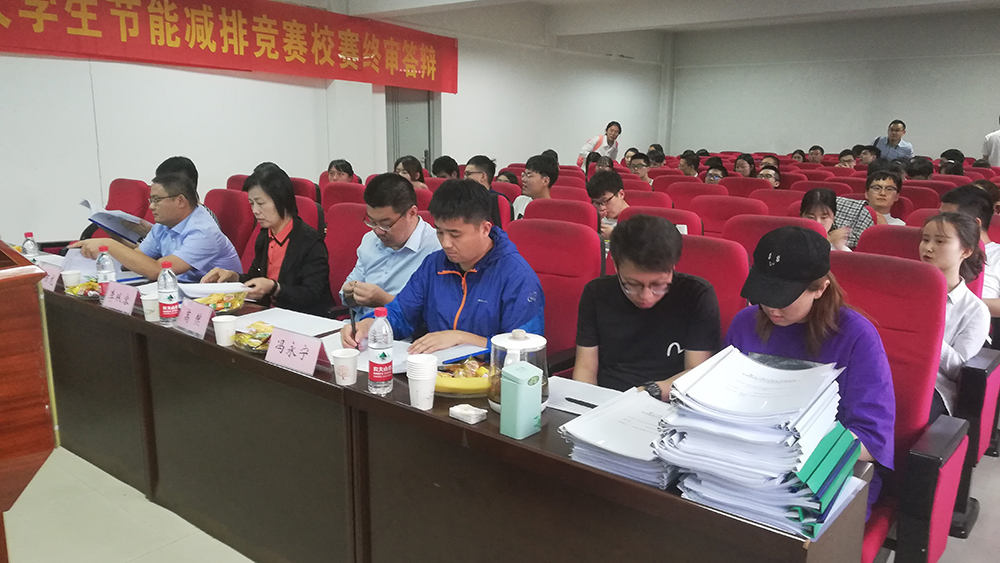 终审答辩邀请到了袁林江、魏剑、张海涵、文刚、杨生炯、高然、李从容、刘佰龙、杨朔等10位老师担任评委。经过5月10日的初审,共有59份作品入围校赛终审答辩环节,其中科技理念类作品30份,社会调研类作品14份,科技实物类作品15份。终审答辩按作品类别分为两个会场同时进行,科技理念类一组,科技实物和社会实践调查一组,答辩陈述时间6分钟,回答问题3分钟。此次竞赛引起了全校同学的广泛关注,参赛学生数量及作品数量创历史新高。答辩现场气氛热烈,各参赛团队紧扣“节能减排,绿色能源”主题,分别从背景,作品理念,创新点,可行性及应用前景等方面进行了阐述。评委们在认真观看选手展示并结合申报书对参赛作品的节能减排实效、可行性、科学性、创新性等方面进行评审,并提出了相应的修改意见和建议。