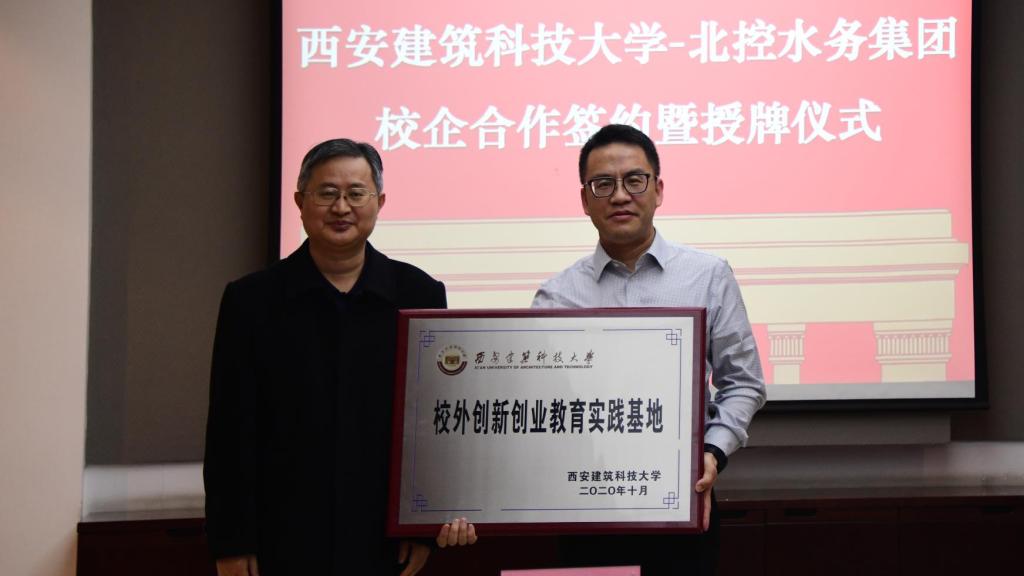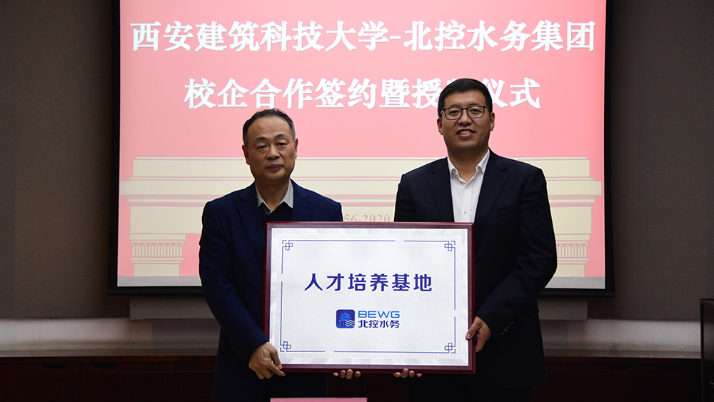 仪式上黄廷林副校长与北控水务集团高级副总裁于立国代表双方签署了校企合作战略协议,并向于立国副总裁和北控水务研究院常务副院长薛晓飞颁发兼职教授聘书。雷竞技RAYBET党委书记王劲松向北控水务集团代表颁发校外导师的聘书。校学生工作部(处)马宗方部(处)长、创新创业教育办公室何廷树主任分别向北控水务集团授予“就业实习与社会实践基地”和“校外创新创业教育实践基地”匾牌,北控水务集团人力资源中心副总经理、北控水务学院副院长冀广鹏向学校授予“人才培养基地”匾额,校教务处长肖国庆接牌。