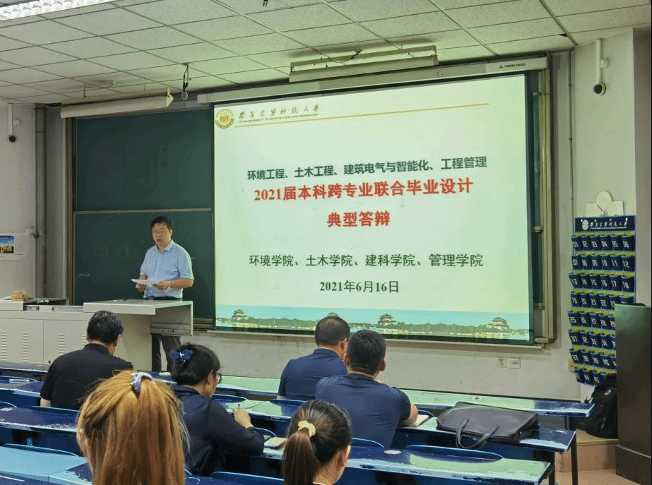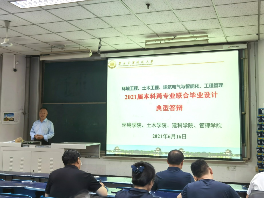 6月16日上午,雷电竞ray官网环境工程、土木工程、建筑电气与智能化、工程管理2021届本科跨专业联合毕业设计(论文)答辩会在雁塔校区南阶206顺利举行。雷电竞ray官网本科生跨专业联合毕业设计,在学校教务处的高度认可和支持下,经过雷竞技RAYBET、土木学院、建科学院和管理学院的师生们共同努力,目前已经连续有效实施三年。这三年来,参与教师进行不断优化完善,逐年扩大专业配比,更新设计题目,优化设计内容。2021年(今年)在设计选题方向上又有新的突破,在污水处理工程设计方向的基础上,增加了固体废物处理工程设计方向,增加了新的教师参与。跨专业联合毕业设计是采用设计院运行模式,培养学生在多学科背景下解决复杂工程问题的能力。通过跨学科-多专业的深度交流,使学生掌握设计过程中不同专业沟通、交底的程序方法,提高学生工程认知、分析、解决、表达和交流能力,实现了多专业背景协同解决复杂环境工程问题的能力培养,构建了工程教育创新型实践模式。答辩会分两个阶段进行。