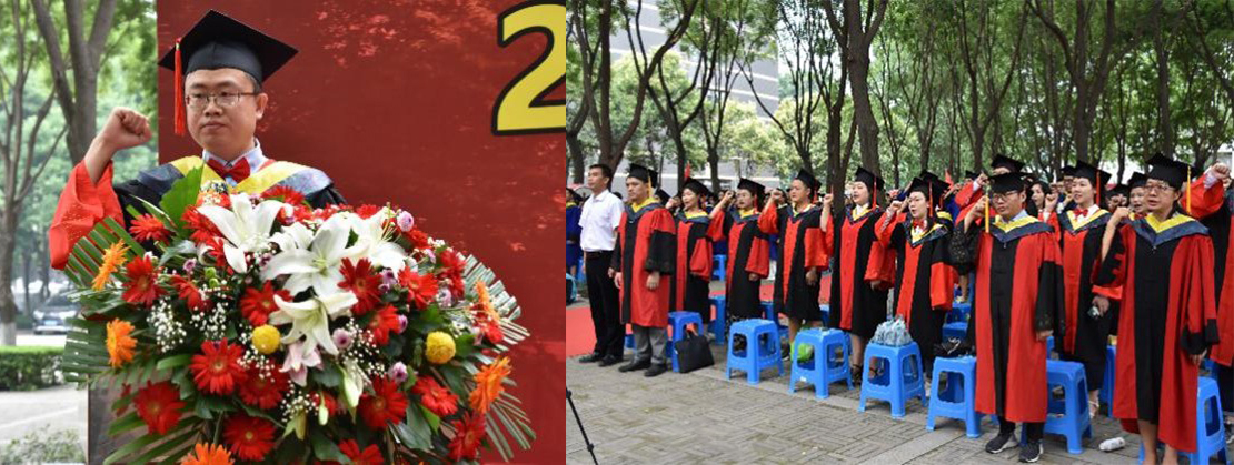 典礼在毕业生宣誓明志环节中进入了高潮,第五届中国互联网+大赛金奖团队负责人2015级博士王雷磊同学带领全体毕业生进行了毕业宣誓。誓言要铭记母校校训,自强、笃实、求源、创新;谨遵师长教诲,正心、明德、励志、笃行;用青春和汗水开拓未来,用聪明和才智创造明天,为实现成才报国的梦想,铸造中华民族的辉煌,奋斗终生。愿同学们勇敢肩负历史的使命,传承母校精神,带着远大抱负和人生理想乘风破浪,展翅高飞。