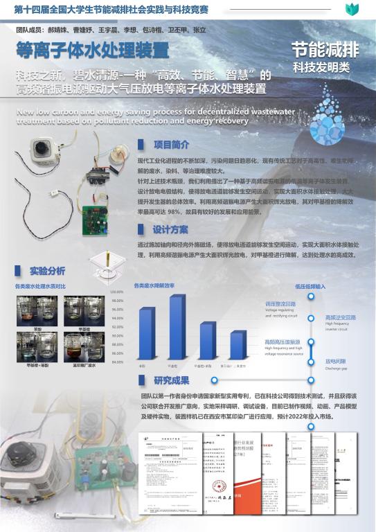 三等奖作品:科技之新,碧水清源——一种“高效、节能、智慧”的高频谐振电源驱动大气压放电等离子体水处理装置。