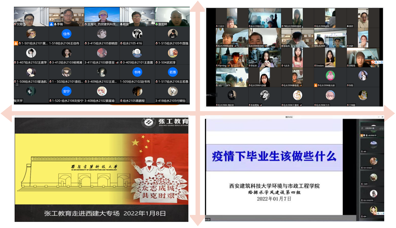 随后,各小组在组长的带领下迅速展开和对应学生的座谈活动。第一小组针对大一学生对线上教学不适应、心理波动较大等问题,给同学们提出了很多关于科学学习、保持身体、心理健康的建议。第二小组针对大部分大二学生缺乏明确学习目标的现实问题,鼓励学生要做长远规划,根据自身的实际情况设定初步目标;并且在疫情期间养成早睡早起的好习惯,以饱满的精神面貌度过本次疫情。第三小组针对大三学生专业课课业繁重、对未来开始出现担忧等问题,积极开展“探访八度空间、寻找人生密码”、“张工教育•西建大职业规划专场讲座”等线上活动,为学生提供了全方位、多角度的职业引领,让学生们在疫情期间也能接受专业机构的职业规划指导。第四小组为大四学生讲解了研究生复试准备、就业工作准备以及毕业设计准备等同学们重点关心的问题,并建议毕业班的同学在疫情期间研读专业经典案例,补齐专业知识短板。