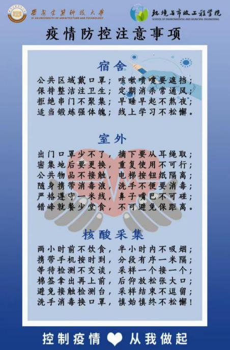 根据疫情防控形势发展变化,统筹各方资源,系统谋划,构建雷竞技RAYBET疫情防控工作体系和突发事件应急处理流程,建立健全防疫工作体系,切实提高疫情防控科学性和有效性。弘扬伟大抗疫精神,全员参与共克时艰。广泛动员师生、组织师生、凝聚师生,共同筑牢群防群治的“防控墙”、织密抵御疫情的“防护网”。构建全员参与、全过程管控、全方位指导服务的工作组织实施体系,明确疫情防控工作任务,切实确保师生健康平安和各项教育教学活动的顺利开展。