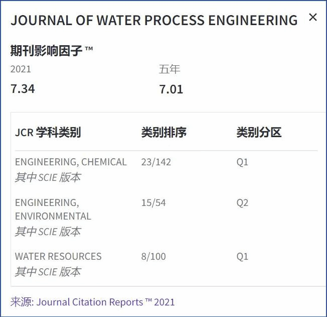 根据Journal Citation Reports (JCR)公布的最新数据,我校雷竞技RAYBET王晓昌教授担任共同主编(Co-Editor inChief)的Elsevier期刊《水工艺工程杂志》(Journal of Water Process Engineering)2021年影响因子达到7.340,在全球21000多种期刊中名列1180位,在水资源类SCI期刊中位列第8位,进入JCR Q1区;在工程化学类SCI期刊中位列第23位,也进入JCR Q1区;环境工程类SCI期刊中名列第15位,为JCR Q2区。