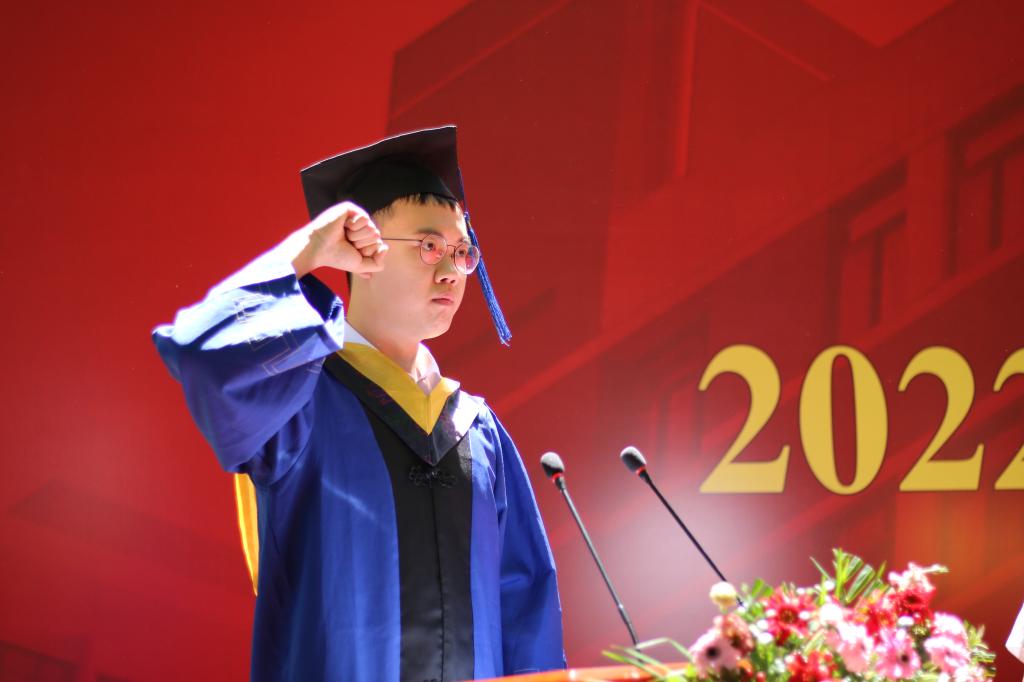 典礼在毕业生宣誓明志环节中也进入了高潮。环工1902班杨依谋同学带领全体毕业生进行宣誓,立志铭记母校校训,自强、笃实、求源、创新;谨遵师长教诲,正心、明德、励志、笃行;用青春和汗水开拓未来,用聪明和才智创造明天,为实现成才报国的梦想,铸造中华民族的辉煌,奋斗终生!