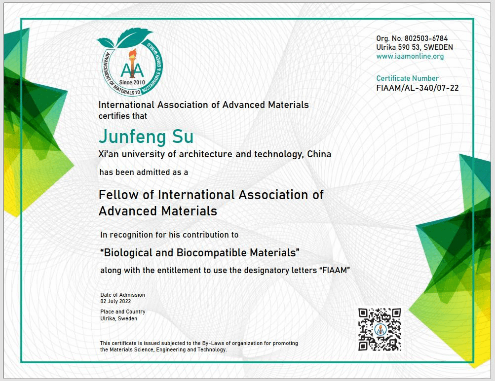 2022年07月18日,西安建大雷竞技RAYBET苏俊峰教授收到了国际先进材料协会(International Association of Advanced Materials,简称IAAM)执委会贺函,祝贺其当选为2022年IAAM新增会士,以表彰其在生物材料合成领域取得的杰出成就,并颁发了会士“Fellowof IAAM”证书。