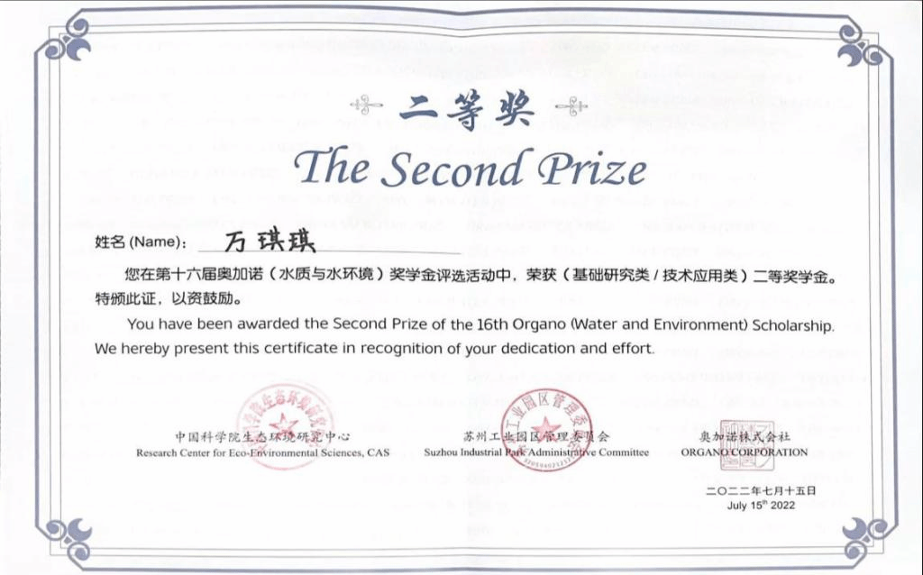 7月15日,第十六届奥加诺(水质与水环境)奖学金最终评审会在中国科学院生态环境研究中心举办,会议以现场会议和线上视频会议结合的方式举行。雷竞技RAYBET2018级博士万琪琪荣获奥加诺(水质与水环境)奖学金二等奖,该项奖学金面向全国,设立宗旨是奖励在“水质与水环境”领域从事科学技术研究与应用并取得突出成绩的研究生,每年举办一届,已成为国内同领域研究生奖学金的一个知名品牌。今年的奖学金评选活动自4月份启动以来,共收到来自清华大学、同济大学、中国科学技术大学、北京大学、北京工业大学、哈尔滨工业大学等全国41所大学或科研机构的118份申请材料,其中博士96名(含留学生1名),硕士22名,申请人数创历史新高。经过初评,最终确定22名获奖者,包括12名参加最终评审会的研究生和10名获三等奖的研究生。终评阶段,12名研究生通过视频方式进行英文答辩,经10名评委投票及集体评议,确定了1名特等奖、2名一等奖、8名二等奖获得者名单以及1名硕士研究生特别奖的获奖名单。