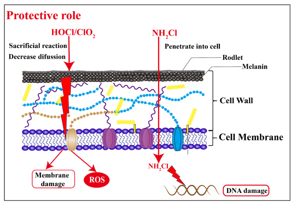 本研究发现黑色素是影响氯基消毒剂灭活真菌效率的关键因素。根据黑色素与消毒剂之间反应活性不同以及不同氯基消毒剂灭活曲霉孢子的灭活机理,分析了黑色素对曲霉孢子保护作用原理。如图2所示,位于细胞壁中黑色素会与氯和二氧化氯反应导致消毒剂被消耗,从而降低消毒剂的浓度并阻止消毒剂进一步向细胞内扩散破坏细胞内部结构,最终降低氯和二氧化氯的灭活效率。而氯胺由于具有较强的渗透性,以及与黑色素较低的反应活性,可以不受黑色素影响直接穿透细胞壁进入细胞内部损伤细胞DNA,因此黑色素对氯胺灭活效率无显著影响。该研究对选择合适的氯基消毒剂控制真菌尤其是产生黑色素的真菌具有一定指导意义,同时在一定程度阐明黑色素的保护作用是真菌耐氯性较强的原因之一。
