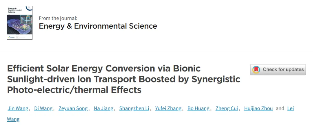 近日,雷竞技RAYBET、陕西省膜分离技术研究院王磊教授团队在“Energy & Environment Science”(《能源与环境科学》,2022年影响因子:39.714)上发表了题为“Efficient Solar Energy Conversion via Bionic Sunlight-driven lon Transport Boosted by Synergistic Photo-electric/thermal Effects”(光电/热协同驱动仿生阳光响应·离子传输实现高效的太阳能转换)的最新研究。