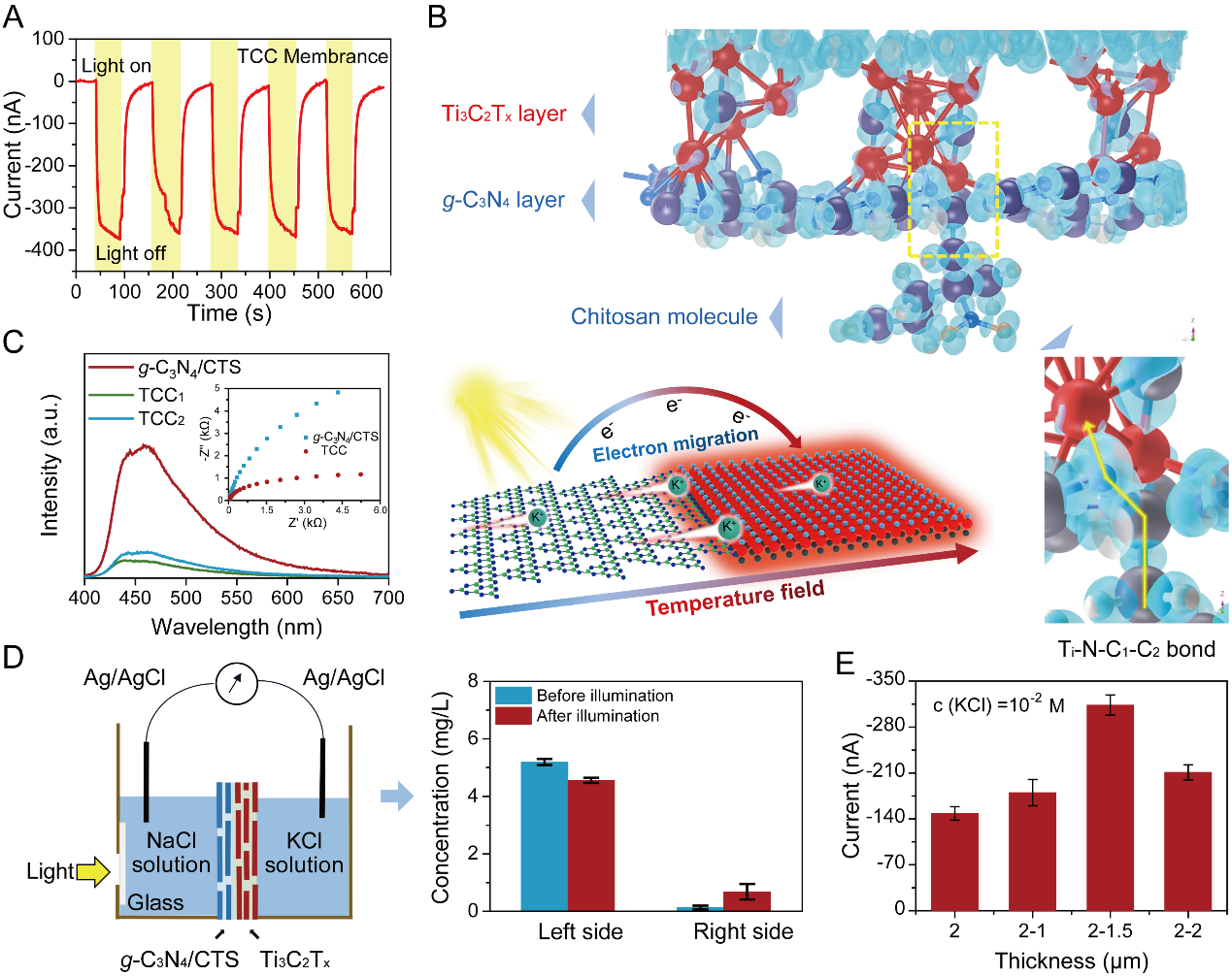 作者首先分别对Ti3C2Tx与g-C3N4/CTS均质二维层状膜内的离子传输情况进行了实验,结果表明离子在两种层状膜内纳米通道中的输运过程均受到通道表面电荷的重要影响,特别是在电解质浓度较低时,纳米通道表面电荷的静电作用更强,Ti3C2Tx和g-C3N4/CTS的跨膜离子电导也与溶液浓度呈现出非线性关系。在光驱动离子传输方面,两种均质膜内的离子传输均受到了外界光照的影响。当光照射Ti3C2Tx薄膜单侧60s,光电流值增加到-130nA。利用热红外相机对Ti3C2Tx膜表面温度的实时观测发现,随着照射时间的增加,Ti3C2Tx膜表面温度出现快速升高,可以推测由于纳米通道内温度梯度的出现,离子出现了主动传输的现象。将液池内分别加入具有不同温度的溶液时,也观察到了与温差方向相反的明显的电流值,从实验角度证明不对称温度条件对离子传输的影响,且离子倾向于从低温区域流向高温区域定向移动。从热力学角度,由于光照区域附近溶液的吉布斯自由能由于温度的升高而减小,离子将自发的向吉布斯自由能递减的方向扩散,基于连续泊松-能斯特-普朗克理论和爱因斯坦-斯托克斯理论数值模拟证明,这一从低温侧向高温侧的定向传输导致在纳米通道的出口处出现了K+的明显消耗和Cl-的轻微积累。在g-C3N4/CTS膜的光响应特性研究中发现,在光照条件下也出现了明显的离子电流。然而在光照下,通过实时监测膜表面温度,发现g-C3N4/CTS膜表面温度并无明显变化,因此排除了光热效应的可能性。基于UV-可见漫反射光谱和Mott-Schottky测算可以看到,由于g-C3N4的半导体特性,在光照下电子与空穴将发生分离,电子向未光照部分的扩散将导致g-C3N4/CTS膜上的电荷分布不对称,从而也激发了光驱动离子迁移现象。