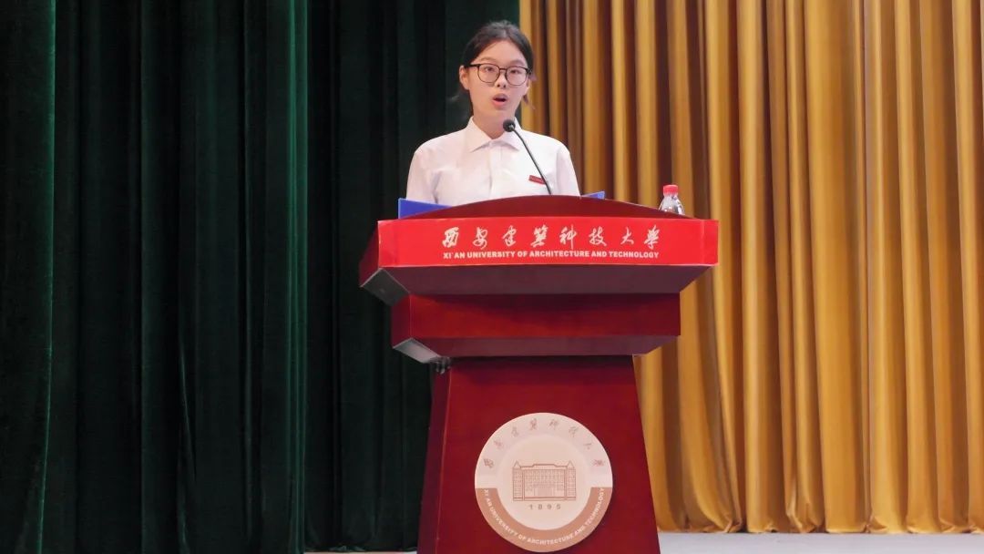 典礼第六项,新生代表给水2302班蒋祎涵同学发言。她代表全体新生表态:定会懂得感恩、勤奋好学、积极上进,牢记“纸上得来终觉浅,绝知此事要躬行”的道理,学会理解和关爱,学会交流和互补,在经历磨砺的同时,勇于表现环境青年的凌云之志,努力展现建大学子的非凡风采,扬往昔之雄风,创未来之辉煌,在这个大有可为的时代,秉承“自强、笃实、求源、创新”的校训,发扬“爱我环工,勇攀高峰”的精神。