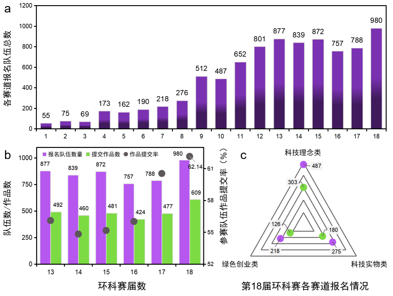 据悉,本次竞赛于4月20日启动报名,并于5月12日在我校举行启动仪式。本届赛事共收到来自全国251所高校980组团队报名,最终提交609件作品,其中科技理念类303组、科技实物类180组、绿色创业类126组,参赛学生达6000人次,创历史新高。其中,我校共160组团队报名,参赛学生达1175人次,包括科技理念类作品91件、科技实物类作品34件、绿色创业类作品35件,占报名团队总数的16.33%,提交作品数目及参赛学生人次也再创新高,充分彰显了我校学子积极投身科创竞赛,高度关注环境问题,致力于为环境领域贡献自己的一份力量。