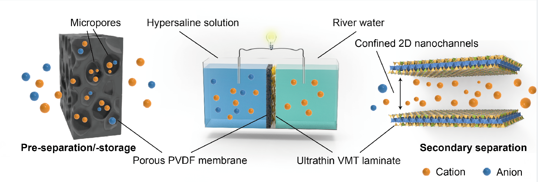图1源自“Nature Communications”登载的王磊教授团队开发的基于二维蛭石纳米材料的异质纳米通道膜。蛭石纳米通道膜独特的结构设计,实现了离子在膜内“初步富集+二次分离”选择性传输行为(图2)。得益于此,即使在高浓度盐度为5 M(盐度梯度为500倍)的极端条件下,蛭石纳米通道膜仍表现出高效稳定的渗透能回收性能,输出功率密度(Pmax)可达到33.76 W/m2。为了进一步证明该体系在实际高盐环境渗透能收集场景中的应用性能,团队选用多种青海当地的实际盐湖卤水进行了验证,并获得了最高25.9 W/m2的功率密度(图3)。该工作展现了在实际高盐卤水、工业废水中实现渗透能有效收集的潜力,对于可持续能源的发展具有重要的意义。