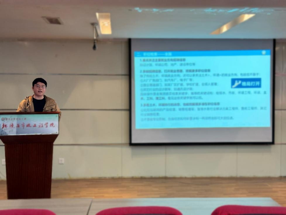 随后,市政2103班文正红同学作经验分享。他以个人简介、职位检索、简历撰写、面试技巧四部分为基础展开分享,首先指出在信息检索方面应重点关注主要就业方向招聘信息,同时也应挖掘相关行业招聘信息,打开就业新思路;其次针对简历撰写,他强调应多用动词、数据量化相关成果,直观展示自身能力,吸引面试官眼球;最后,针对求职面试,他建议同学们着重考虑稳定性问题,充分了解面试企业的相关业务范围、企业文化等内容。