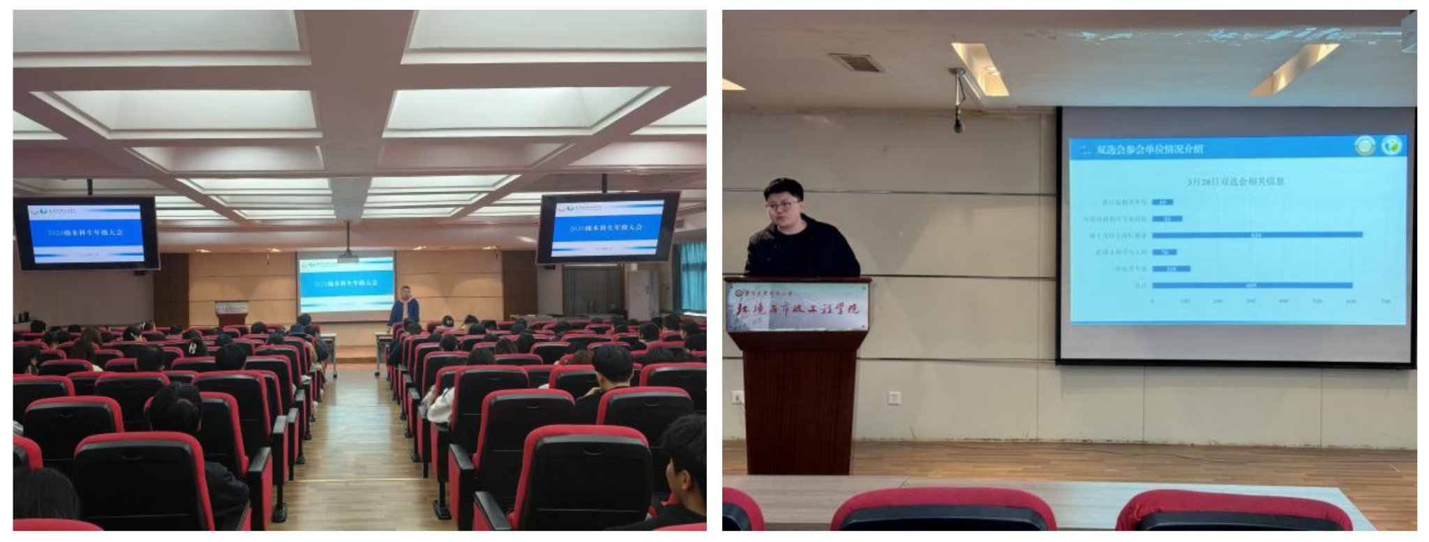 两位老师首先分别针对2024届本硕毕业生基本情况进行了简要介绍,并针对目前签约情况做了详细报告与分析,帮助同学们明确把控所学专业的就业形势;随后,他们针对近期学校招聘会安排、就业相关流程进行了逐一说明,助力同学们了解就业过程中重要资源以及时间截点;其次,两位老师强调,下半学期是完成毕业设计、毕业论文的重要时间段,各位同学要高度重视,保质保量完成本硕阶段最后一步考核;最后,两位老师提出如下建议:找准定位,做好准备,拓宽信息获取渠道,多多参与线下招聘宣讲会;优先就业,再定行业,充分把握应届生身份,先就业再择业;增强信心,沉着应对,面对招聘笔试面试调整好心态,敢于迎接挑战。