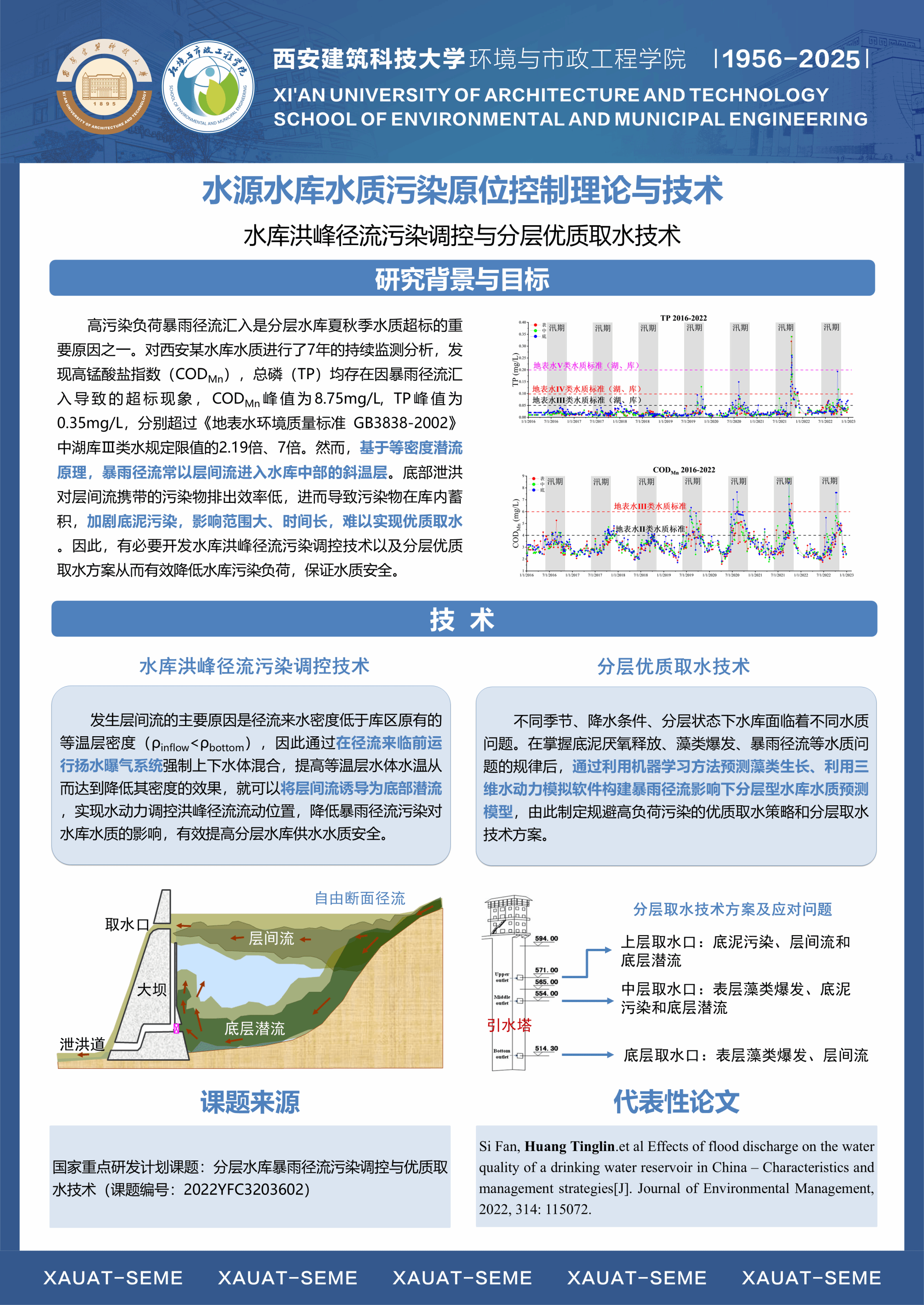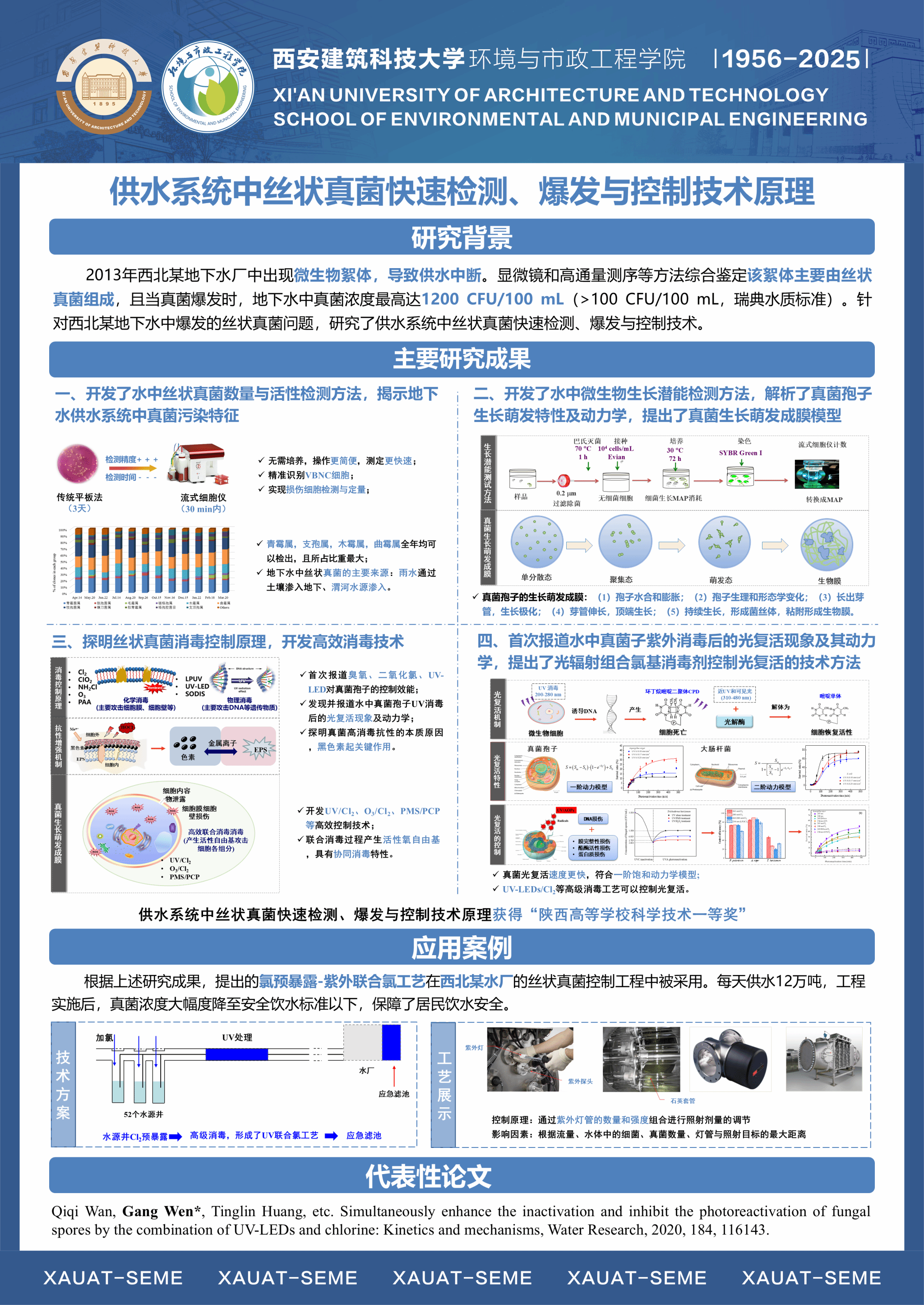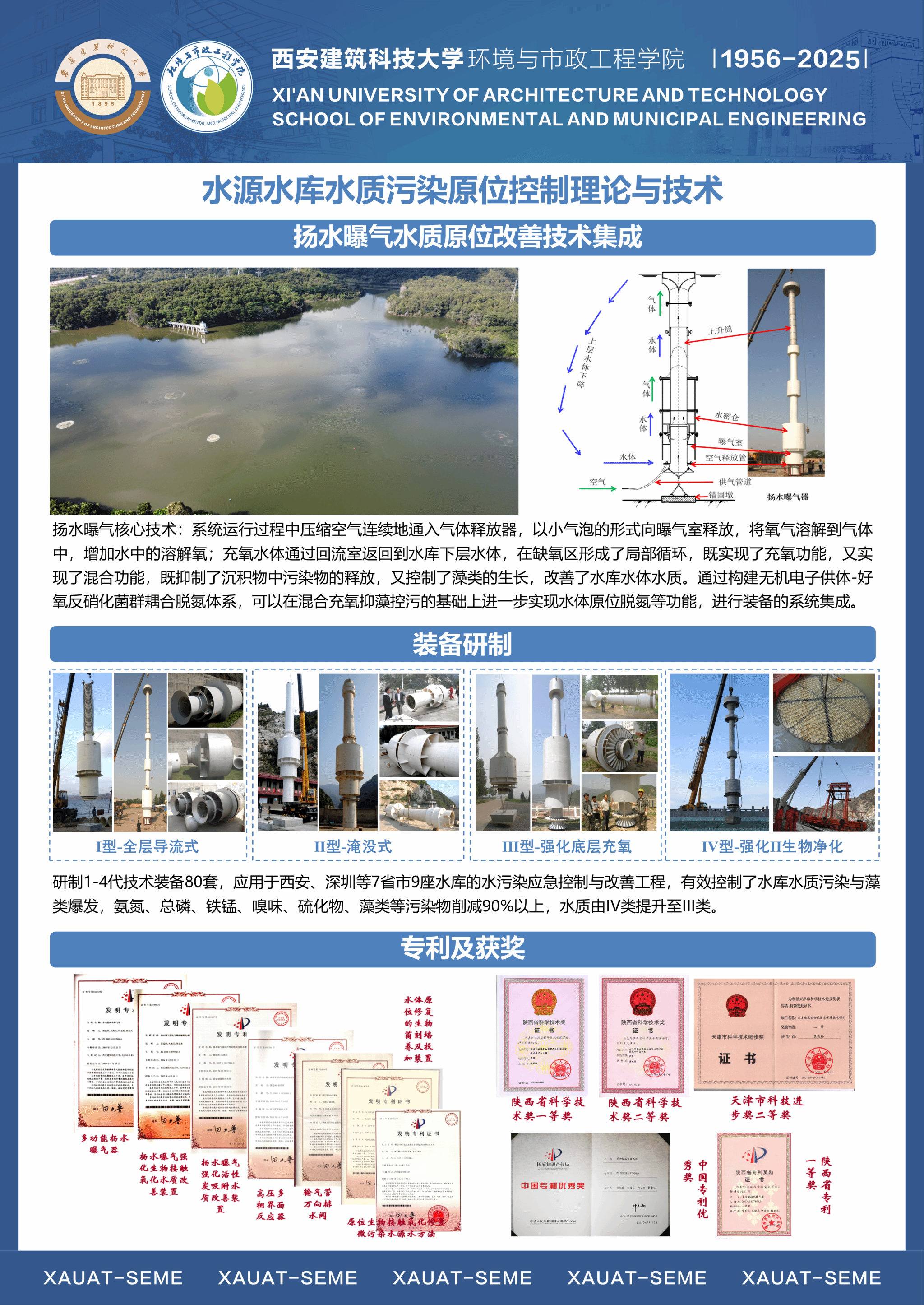 团队针对水源富营养化与藻类污染、内源与径流污染、饮用水生物与水质安全等国内外水环境领域的共性突出问题和难题,以“水源水质污染原位控制与饮用水安全保障”为主攻方向,形成了包括①气-土-水复合环境中污染物迁移转化及水动力学调控,②水源富营养化与内源污染混合充氧及强化生物控制,③诱导水体持续自然混合改善水质与生态净化功能修复,④循环造粒流化床及化学自催化氧化水质净化,⑤饮用水中生物控制与水质安全保障等5个优势研究方向。团队依托国家重点学科、省部重点实验室、协同创新中心、野外站等高层次平台,结合主持的国家863重大专项、基金重点项目、重大水专项、科技支撑与重点研发计划项目等课题的研究,充分发挥团队成员在水质工程学/水文学/环境流体动力学/生物与生态学/沉积与地球化学等相关领域的研究专长,通过协同攻关,取得了从理论创新、关键技术突破、装备研制到工程应用的系统性创新成果。团队近三年获批国家重点研发计划项目1项、课题2项,获批国家自然科学基金面上项目6项、青年项目1项,获陕西省科技一等奖等教学和科研奖励12项,发表高水平学术论文251篇,出版教材和专著3部,授权发明专利27项,负责的2门课程入选国家一流本科课程,完成国家和省级课程建设5门。
