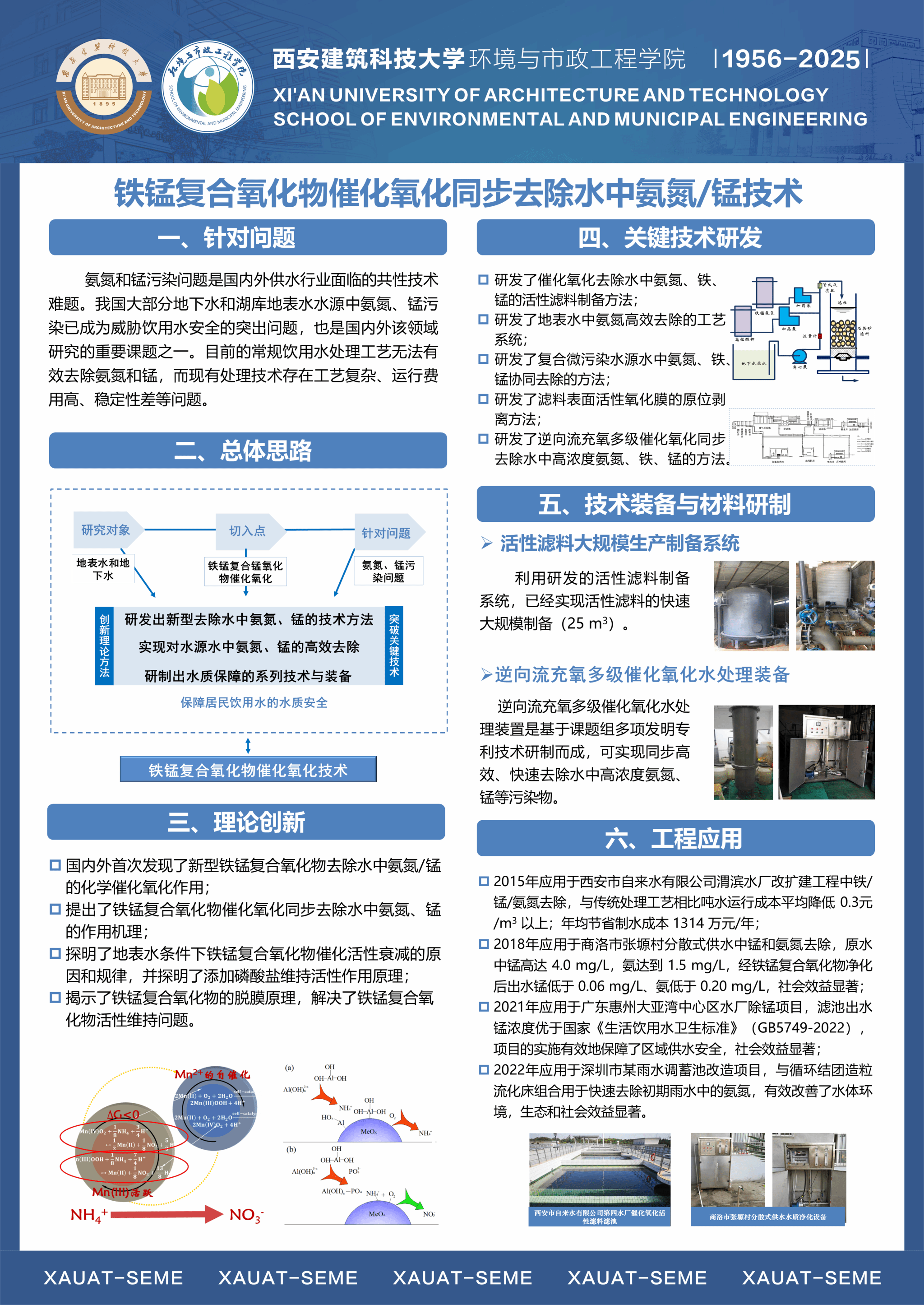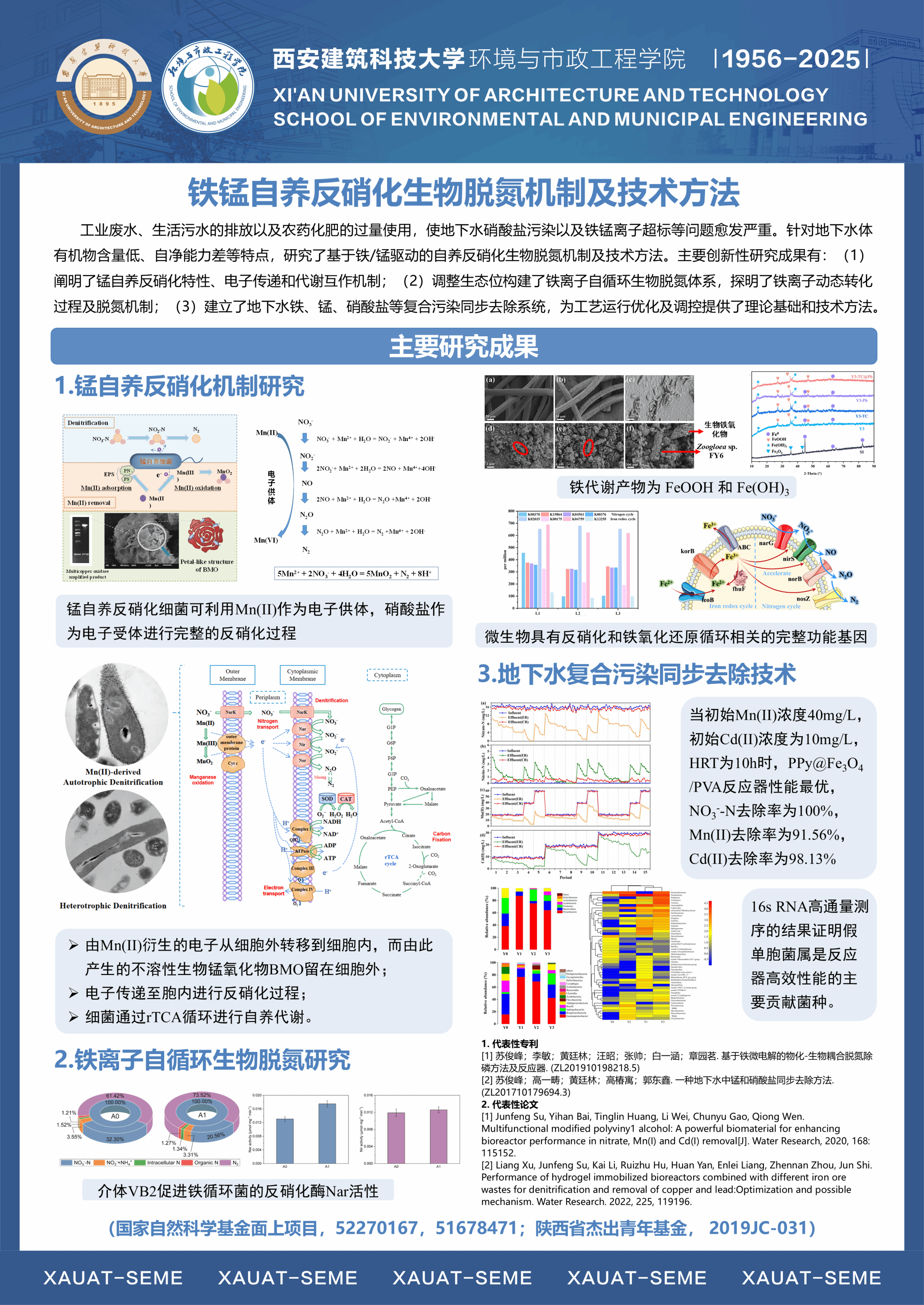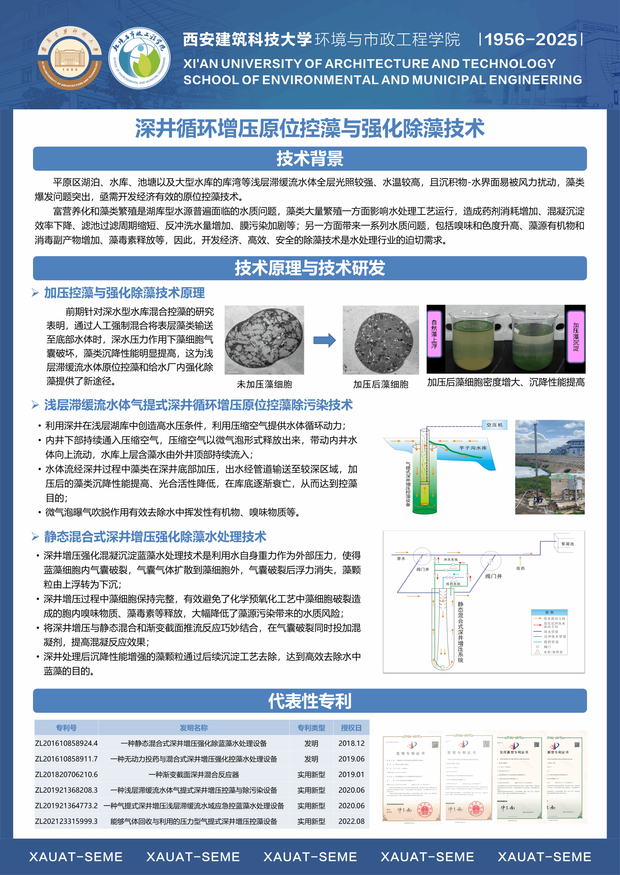 团队针对水源富营养化与藻类污染、内源与径流污染、饮用水生物与水质安全等国内外水环境领域的共性突出问题和难题,以“水源水质污染原位控制与饮用水安全保障”为主攻方向,形成了包括①气-土-水复合环境中污染物迁移转化及水动力学调控,②水源富营养化与内源污染混合充氧及强化生物控制,③诱导水体持续自然混合改善水质与生态净化功能修复,④循环造粒流化床及化学自催化氧化水质净化,⑤饮用水中生物控制与水质安全保障等5个优势研究方向。团队依托国家重点学科、省部重点实验室、协同创新中心、野外站等高层次平台,结合主持的国家863重大专项、基金重点项目、重大水专项、科技支撑与重点研发计划项目等课题的研究,充分发挥团队成员在水质工程学/水文学/环境流体动力学/生物与生态学/沉积与地球化学等相关领域的研究专长,通过协同攻关,取得了从理论创新、关键技术突破、装备研制到工程应用的系统性创新成果。团队近三年获批国家重点研发计划项目1项、课题2项,获批国家自然科学基金面上项目6项、青年项目1项,获陕西省科技一等奖等教学和科研奖励12项,发表高水平学术论文251篇,出版教材和专著3部,授权发明专利27项,负责的2门课程入选国家一流本科课程,完成国家和省级课程建设5门。