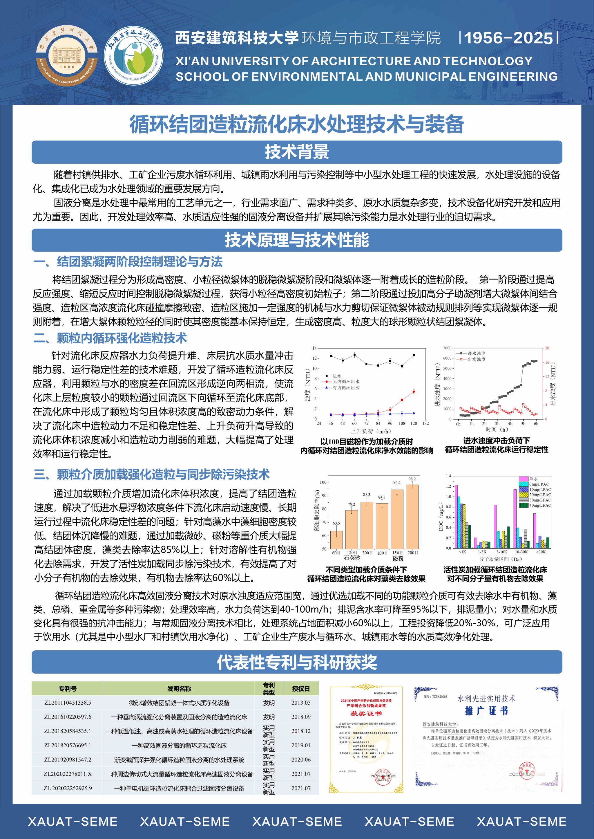 近5年,团队研发的5大类核心技术与装备涵盖了从水源水质污染应急控制与水质改善、季节多变与复合污染水质的一体化高效处理、工矿企业水质稳定与废水零排放、初期雨水高速净化与资源化等多个行业领域,其中《水源水库扬水曝气水质污染控制技术》和《循环造粒流化床高效固液分离技术》被水利部2020年认定为“水利先进实用技术”重点推广;研发的《化学结晶循环造粒流化床技术》和《循环造粒流化床高效固液分离装备》入选2023年工信部和水利部“国家鼓励的工业节水工艺、技术和装备目录”。研发的技术设备在全国17省的105项工程中得到大规模应用和转化,应用专利技术设备共计274台套;专利转让或许可费用超2000万元,经济、社会、环境效益极为显著。