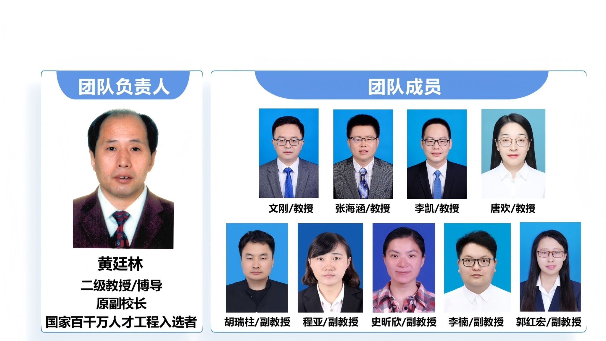 团队入选教育部“长江学者和创新团队发展计划”创新团队,陕西省黄大年式教师团队以及陕西省三秦英才特殊支持计划-创全国一流团队。团队核心成员共有9人,其中教授4人,副教授5人。团队成员中1人获批国家高层次青年人才,2人获得陕西省杰出青年科学基金,2人获得陕西省特支计划青年拔尖人才,2人获得陕西省青年科技新星,1人获得陕西省普通高校首届“青年杰出人才”,1人获得西安青年科技人才等称号。