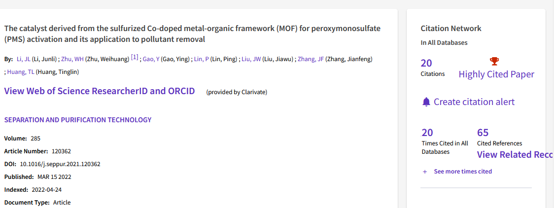 根据科睿唯安基本科学指标(Essential Science Indicator,ESI)于2022年11月10日发布的最新数据,智能化环境治理技术团队成员于2022年3月在期刊《分离与纯化技术》(Separation and Purification Technology)上发表的文章“The catalyst derived from the sulfurized Co-doped metal-organic framework (MOF) for peroxymonosulfate (PMS) activation and its application to pollutant removal”(https://doi.org/10.1016/j.seppur.2021.120362)入选ESI高被引学术论文。论文第一作者为李俊丽硕士研究生,通讯作者为朱维晃教授,完成单位为雷竞技RAYBET。