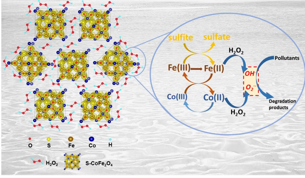 研究结果表明,在未调节的近中性pH条件下,30min内S-CoFe2O4/H2O2体系对抗生素废水与染料废水的去除率分别可达90 %和100 %左右。与未硫化的CoFe2O4相比,硫的掺杂能有效提高催化剂的比表面积,为芬顿反应的进行提供充足的活性位点。此外,S-CoFe2O4/H2O2体系中的Fe2+/Fe3+,Co2+/Co3+和亚硫酸根/硫酸根之间的协同作用,EPR检测结果证实,S-CoFe2O4使H2O2能够被持续地活化并生成OH•和O2•-等高活性的含氧自由基,从而有效去除污染物。