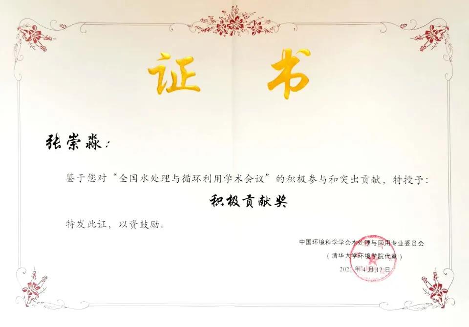 张崇淼教授作为中国环境科学学会水处理与循环利用专业委员会委员,长期致力于水处理循环利用的科研工作,积极贡献科研力量,得到了水处理与循环利用专业委员会支持和肯定,被授予“积极贡献奖”。