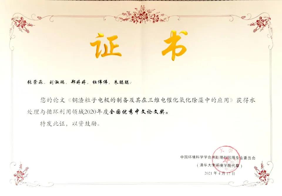 同时,此次环境科学学会水处理与循环利用专业委员会评选了“水处理与回用优秀中文论文奖”,张崇淼教授论文《钢渣粒子电极的制备及其在三维电催化氧化除藻中的应用》荣获水处理与循环利用领域2020年度“全国优秀中文论文奖”。