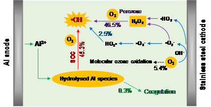 •电凝聚臭氧化耦合工艺中存在臭氧混凝协同增效机制(SOC effects)