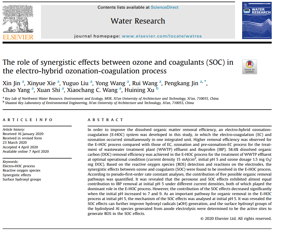 近日,金鹏康教授带领的污水处理与资源化创新团队在臭氧混凝互促增效机制方面的研究取得新进展,相关研究成果以The role of synergistic effects between ozone and coagulants (SOC) in the electro-hybrid ozonation-coagulation process为题发表于环境领域著名期刊Water Research (IF=7.913)。金鑫副教授为论文第一作者,硕士研究生谢新月为论文第二作者,金鹏康教授为论文通讯作者,研究得到了国家自然科学基金青年项目、陕西省教育厅重点实验室项目和陕西省教育厅新型智库的资助。