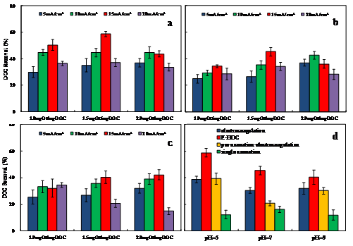 图2 不同操作参数条件下E-HOC耦合体系的DOC去除效果(a. pH5 b.pH7 c.pH9 d.不同工艺DOC去除率对比)