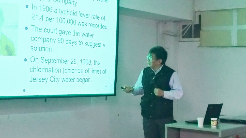 随后,解跃峰教授做主题报告。教授首先用饮用水中消毒副产物超标导致人体铅中毒的事情,抛砖引玉,阐明了本次报告的主题;然后用多个生动有趣例子告诉我们饮用水安全对公共健康的重要性,进而介绍了消毒副产物的热点前沿问题,并强调消毒副产物即使浓度很低也会有很大的毒性;最后根据我国天然气开发产生的废水对消毒副产物生成的影响进行了深入介绍。