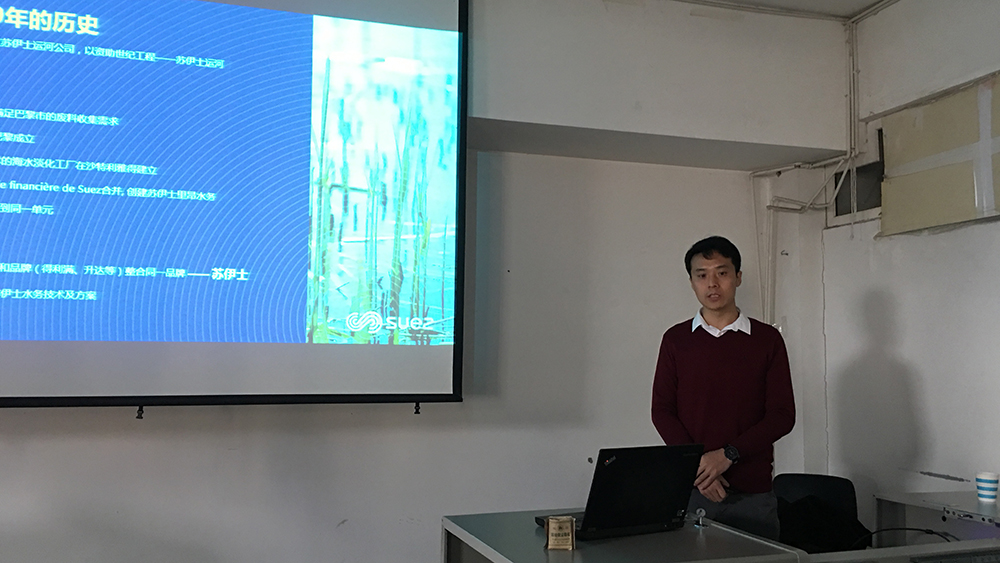 随后,程忠红经理从公司介绍、技术研发、人才培养三个方面展开报告。首先,他介绍到,苏伊士环境集团是拥有120年历史的全球著名环境企业,致力于可持续发展,其业务涉及70多个国家的饮用水、市政污水、全流程工业废水、污泥处理工艺与技术等环境领域相关行业,并处于世界领先水平。其次,他从国家排放标准日趋严格、市场需求逐渐扩大两大背景阐述研发新技术的驱动力。通过对公企业全流程分析,他强调改良现有技术、减少全流程成本是解决污水处理问题的重要措施,同时也是苏伊士环境集团敢于挑战、屹立不倒的重要原因。最后,程经理从组织结构、人培养、内部晋升渠道等方面向大家展示了苏伊士环境集团的人才培养战略。