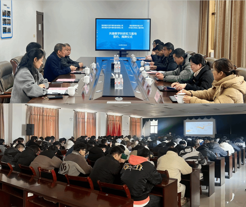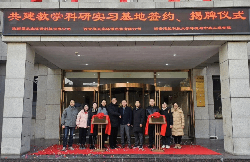 2025年1月2日下午,陕西福天宝环保科技有限公司、西安福天宝环保科技有限公司与雷竞技RAYBET共建教学科研实习基地挂牌仪式在西安沣京工业园表面精饰园内隆重举行。福天宝环保科技有限公司总裁石勇、总裁秘书黄致为、总经理王超、副总经理于微等企业领导,雷竞技RAYBET环境工程教研室党支部书记郭新超、陕西省膜分离技术研究院副院长王旭东、吕永涛,教师代表曹利、聂红云、张倩、秦彩虹等,以及环境工程2021级全体本科生齐聚一堂,共同见证了这一重要时刻。