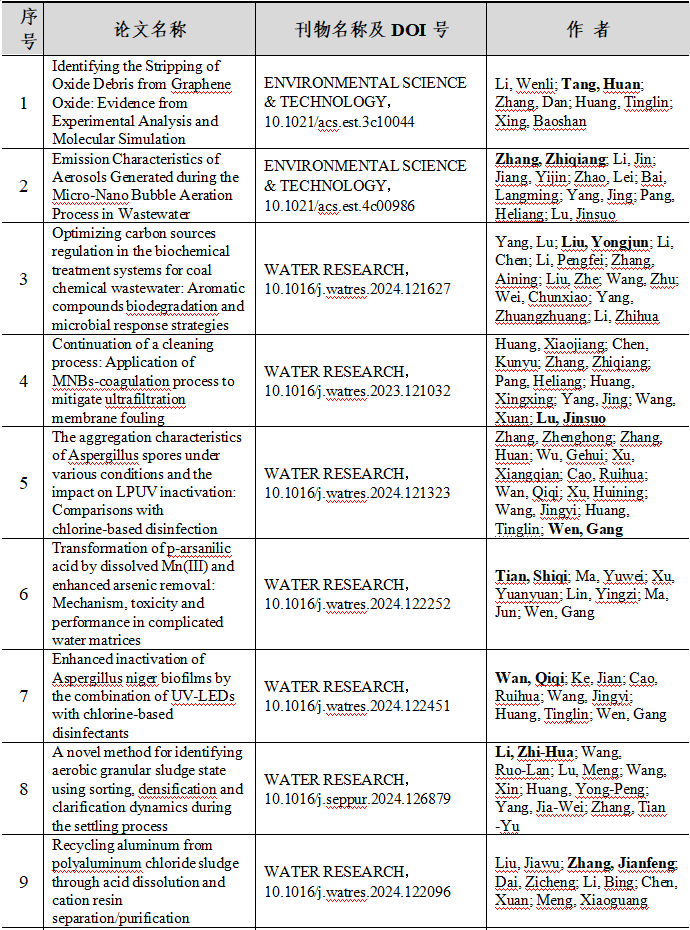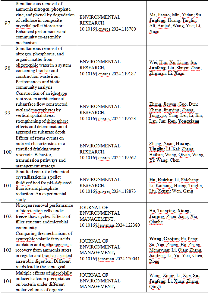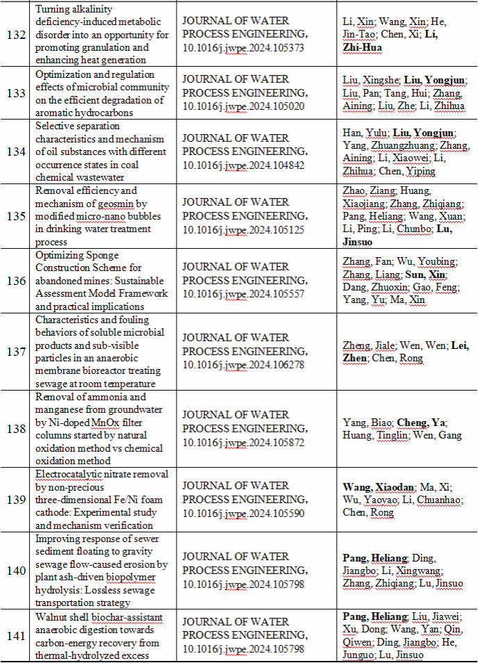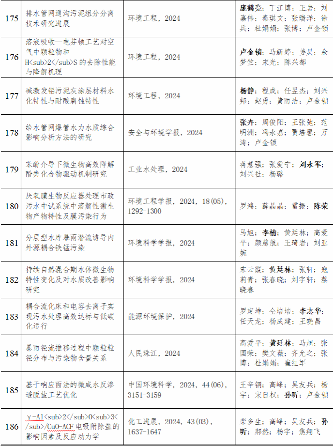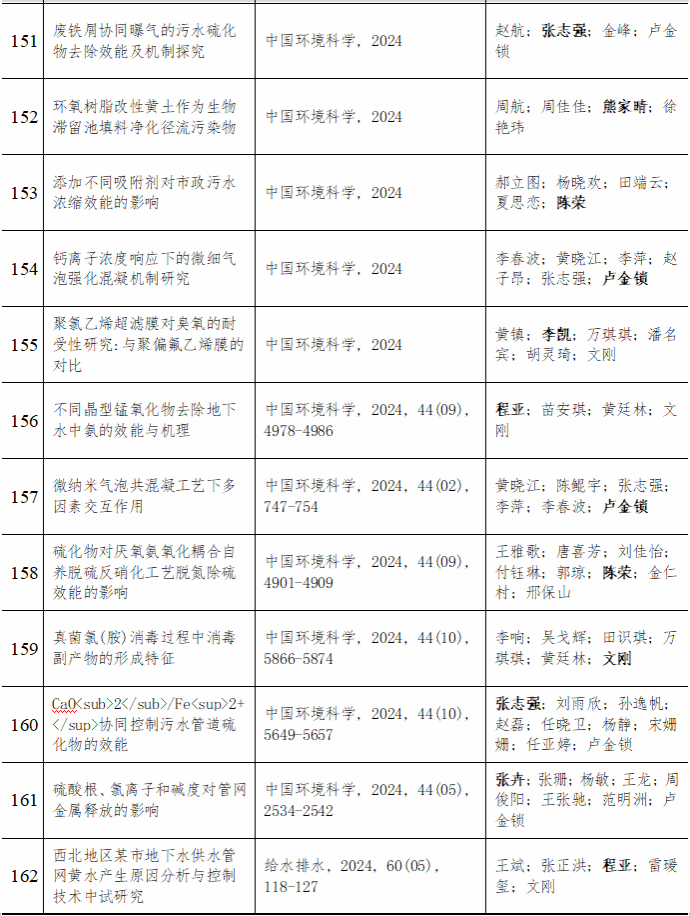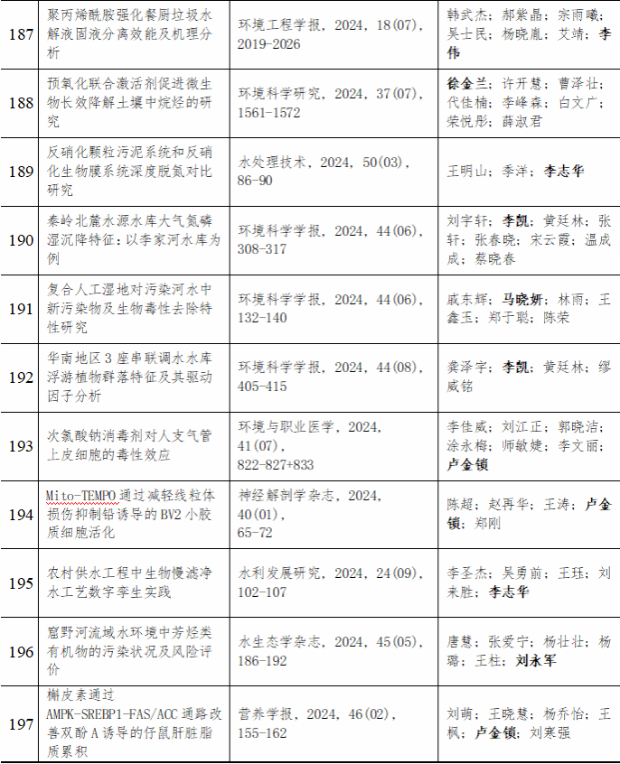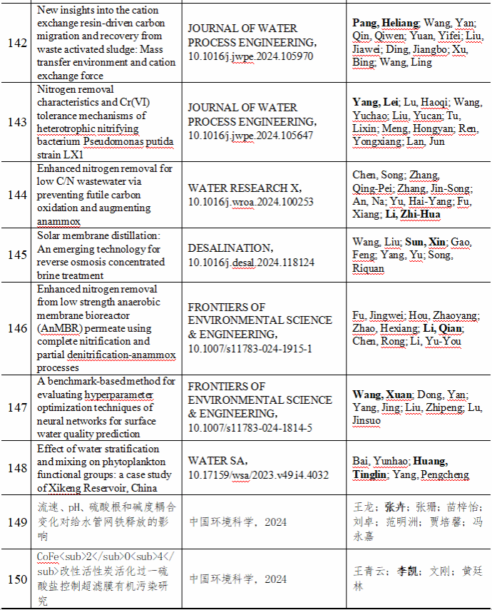 2024 年给排水教研室共发表论文 197 篇,其中 SCI 论文 148篇, SCI一区论文 93 篇,中文论文 49 篇。论文列表见表 8 所示。