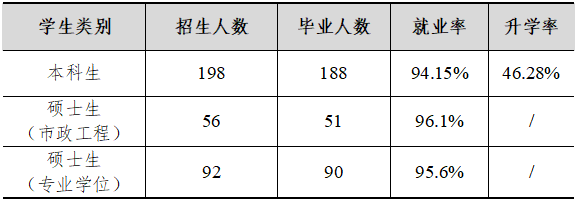 2024年给排水科学与工程专业学术学位硕士招生56人,毕业51人,毕业生就业率达96.1%;专业学位硕士招生92人,毕业90人,毕业生就业率达95.6%。本科生招生人数198,毕业人数188,就业率94.15%,升学率46.28%。