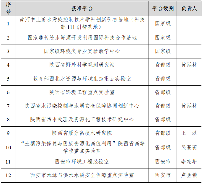 到目前为止,给排水科学与工程专业可以依托的学院平台包括国家级平台3个,省部级平台11个,西安市级平台2个,部分平台见表11所示。