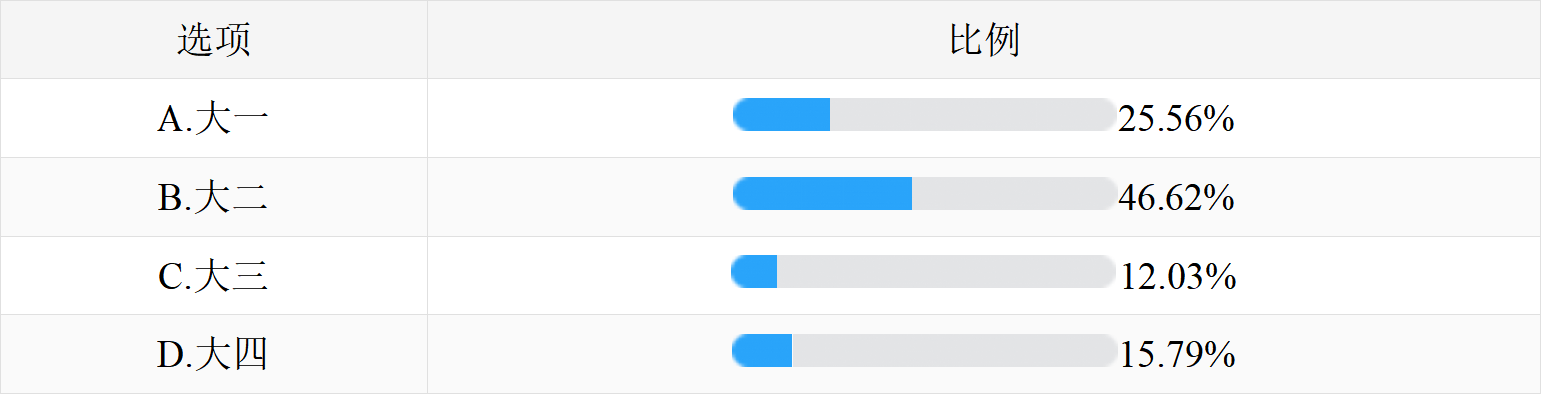 本次线上沙龙活动精彩,在长达2小时的时段里,吸引了约300位师生参与。活动最后,面向与会学生就本次活动开展了线上问卷调查,参与答卷的学生人数达133人,占总与会学生人数的50%。学生各年级分布情况见表1。与会学生基本是环境工程专业学生,覆盖了本科四个年级,其中大一、大二学生占多数,超过70%。其原因可能在于低年级学生尚未接触专业课学习,对专业定位、社会需求不太清楚,对自身发展方向较为迷茫,亟需为明确自己的目标寻求参照。