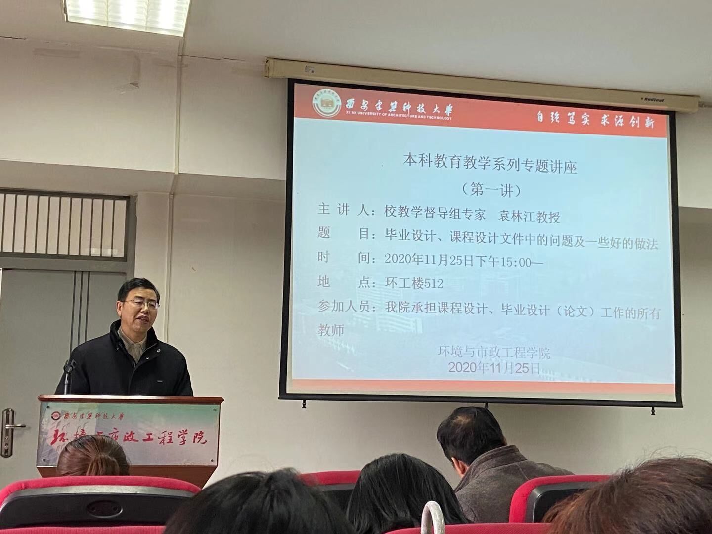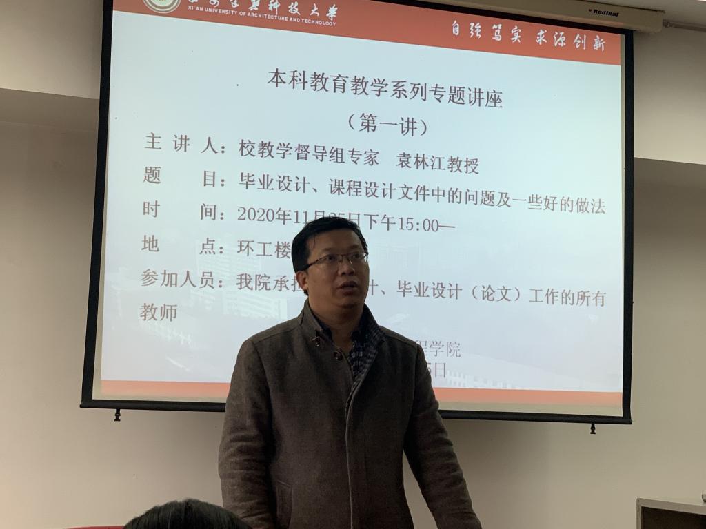 为提升本科教育教学工作质量,11月25日下午15:00,雷竞技RAYBET在环工楼512开展了本科教育教学系列专题讲座第一讲。讲座由校督导组专家袁林江教授围绕“毕业设计、课程设计文件中的问题及一些好的做法”进行讲解,教学副院长刘立忠、教学秘书朱陆莉以及承担了课程设计、毕业设计(论文)工作的所有教师参加了此次讲座。