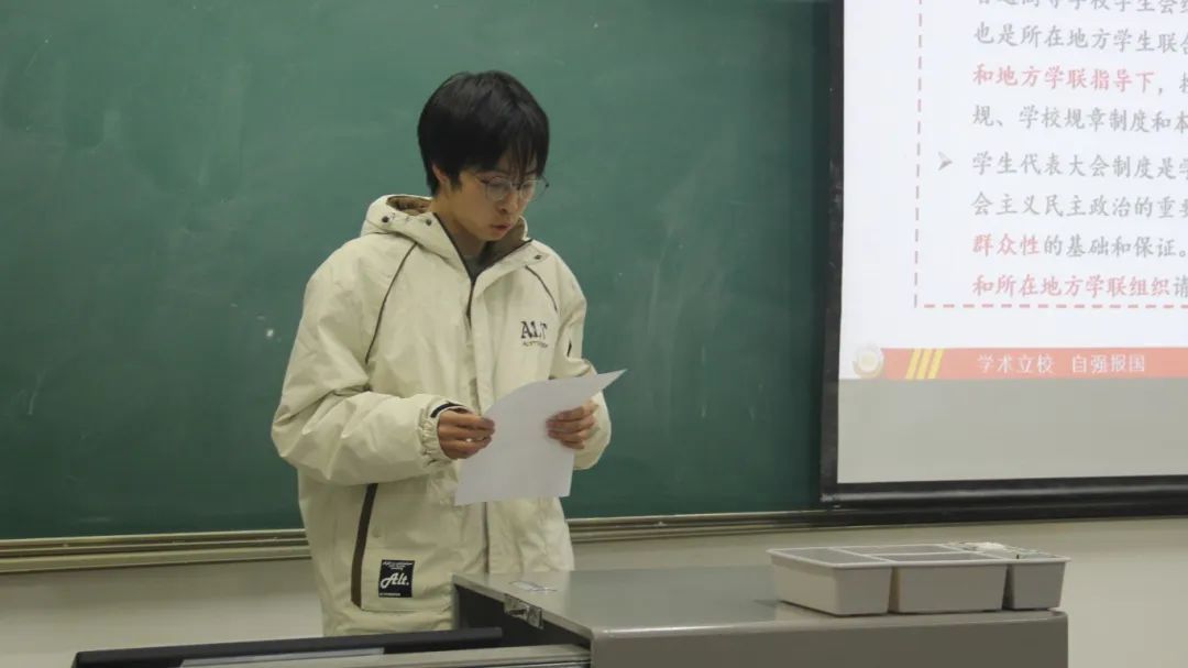 此外,雷竞技RAYBET学生会生活权益部主要负责人王嘉号同学讲述了《普通高等学校学生(研究生)代表大会工作规定》。他详细解析了大会的筹备流程、代表选举办法及议案处理方式等内容,并指出学生代表大会作为体现学生主体地位的重要平台,对于维护学生合法权益、促进学校发展具有不可替代的作用。