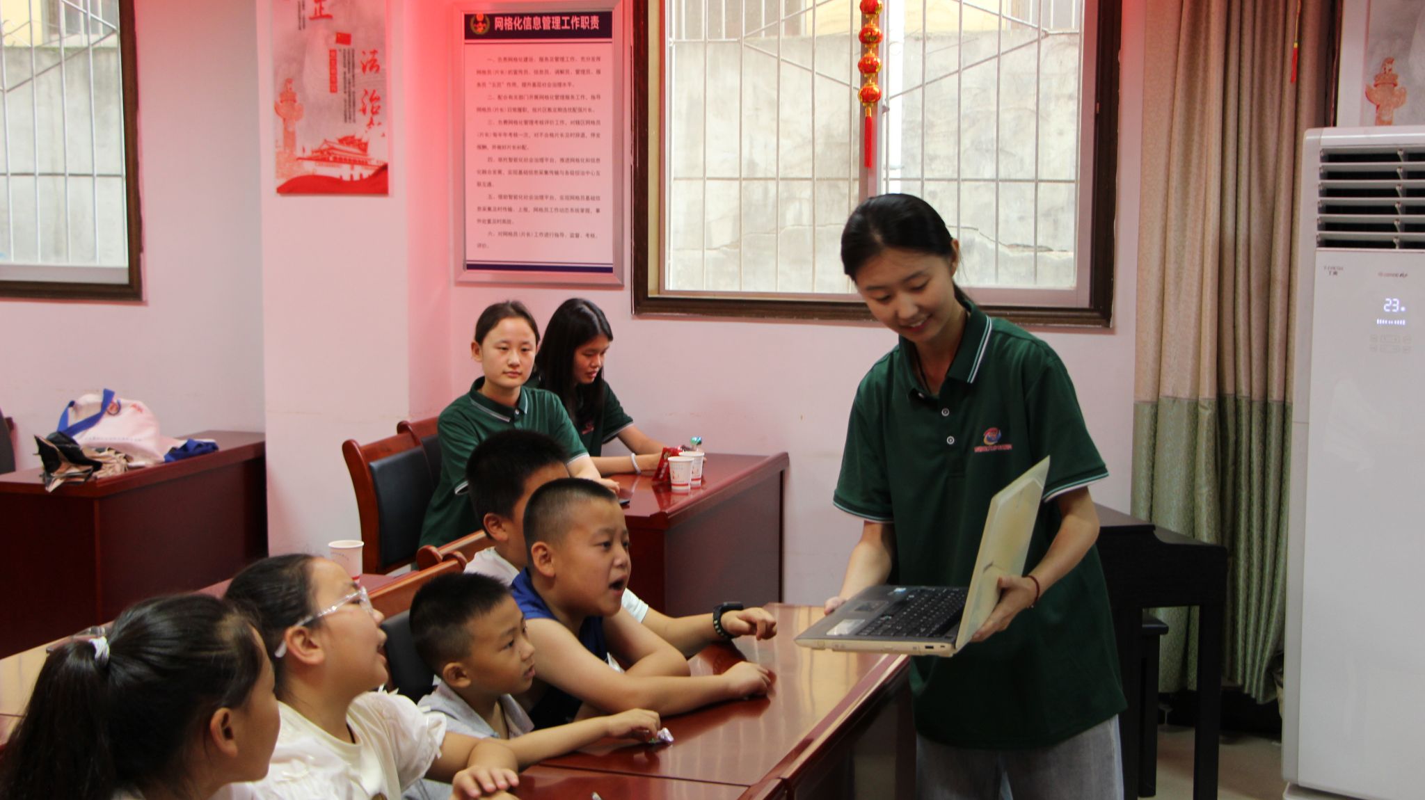 图为团队成员陈昱如同学在张坡社区文明站带领小朋友们朗诵课文《白杨礼赞》。通讯员李泽楷摄