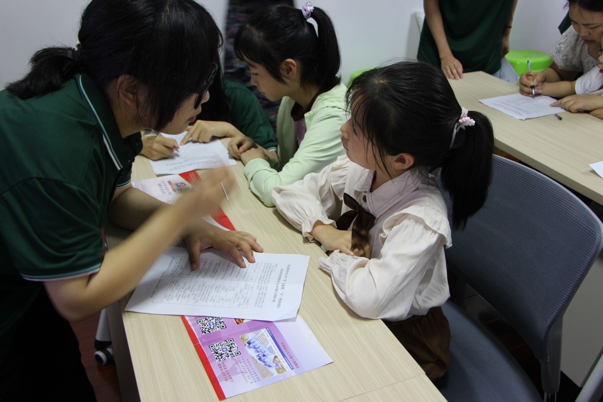 图为团队成员在名人街社区文明站协助小朋友们填写普通话调查问卷。通讯员李泽楷摄
