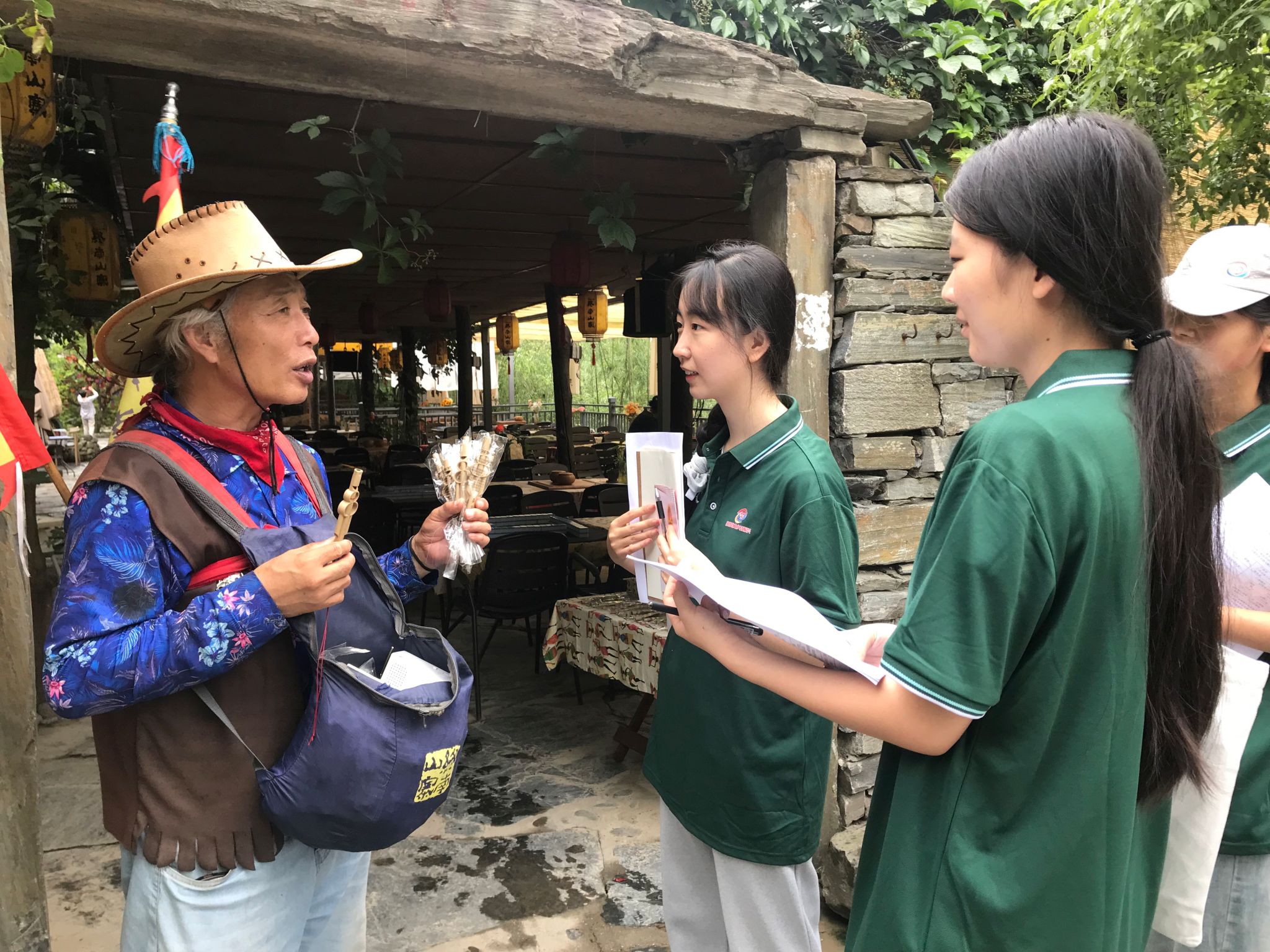 图为团队成员在终南山寨与景区负责人进行交流,了解景区工作人员与游客的普通话使用情况。杨欣悦 摄