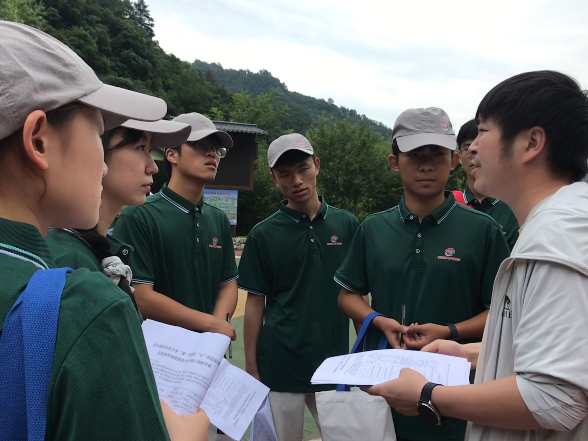 图为团队成员在终南山寨对游客发放普通话调查问卷。任治锦 摄