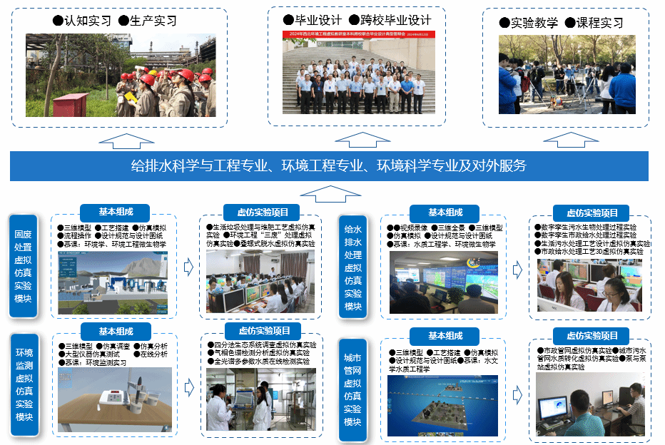 目前,中心已建成完整的虚拟仿真实验教学体系,该体系涵盖给排水处理模块、城市管网设计模块、固体废物处置模块及环境监测模块等4个模块,涉及场景再现、工艺仿真、机理解析、智慧维运等虚拟仿真实验教学内容。以课程教学及认知实习、生产实习、毕业设计为切入点开出虚拟仿真实验教学13项。通过虚拟仿真实验教学,解决了传统实验教学的技术难题,补充和扩展了真实实验教学,实现了课堂教学向工业现场、实习基地的延伸,全面促进了学生自主学习、自主实验、自主创新。
