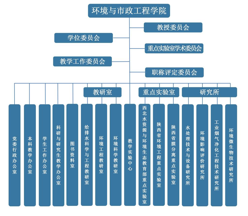 雷竞技RAYBET组织机构由学术机构、行政办公与教学科研管理机构、教研室、实验室、教学实验中心和研究所(研究基地)组成。其中:学术机构包括:教授委员会、学位委员会、职称评定委员会、学术委员会、教学委员会、重点实验室学术委员会、教学督导组。行政办公与教学科研管理机构包括:党委/行政办公室、教学办公室、研究生/科研办公室、学生工作办公室、图书资料室。教研室包括:环境工程教研室、给排水科学与工程教研室、环境科学教研室和热工流力教研室。实验室包括:西北水资源与环境生态教育部重点实验室、陕西省环境工程重点实验室和国家级环境类专业教学实验中心。研究所(研究基地)包括:陕西省污水处理与资源化工程技术研究所、环境工程研究所、水处理技术与设备研究所、环境影响评价研究所、工业烟气净化工程技术研究所、国家城市非传统水资源开发利用国际科技合作基地和陕西省西部建筑科技重点实验/室省部共建国家重点实验室培育基地。如下图所示: